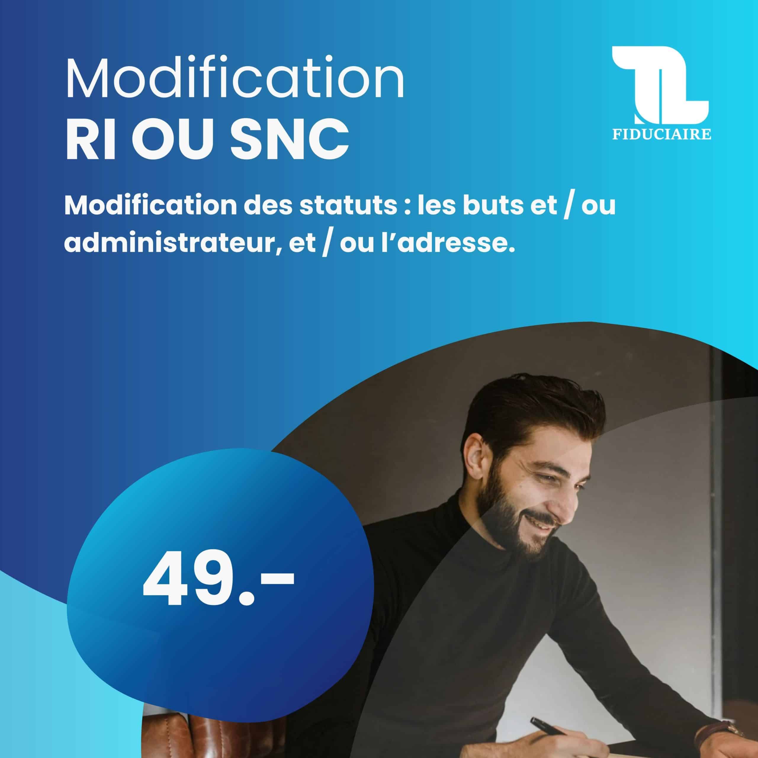 Modification des statuts : les buts et/ou administrateur, et/ou l’adresse. Incluant les frais de fiduciaire, avec le contrôle de la rédaction des buts de l’entreprise. Il n’est pas compris : les frais de modification du registre du commerce.